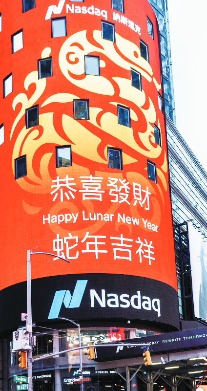 1月27日,在美国纽约,纳斯达克交易所巨型电子屏幕播放蛇年春节祝福。 新华社发 周焕新 摄
