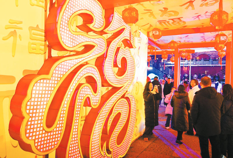 1月28日,人们在湖北省宣恩县城贡水河畔观灯游玩。新华社发 宋文 摄