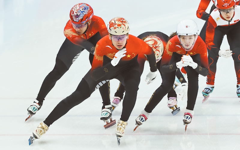 2月6日,中国队队员在赛前训练中练习接力。当日,第九届亚冬会中国体育代表团短道速滑队在黑龙江省冰上训练中心综合馆进行赛前训练。新华社记者 郑焕松 摄