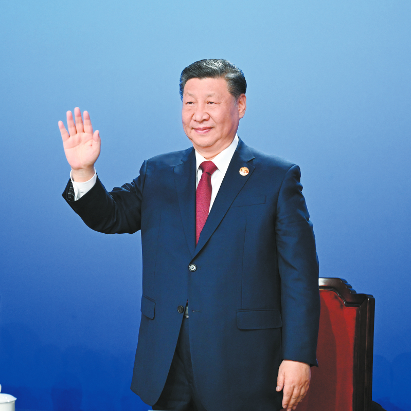 国家主席习近平在主席台上向大家挥手致意。新华社记者 谢环驰 摄