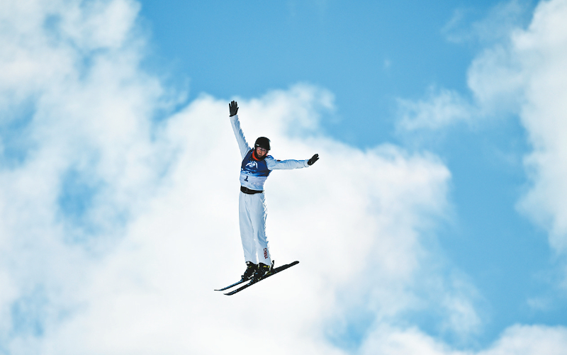 2月9日,李心鹏在比赛中。当日,在亚布力举行的第九届亚冬会自由式滑雪男子个人空中技巧决赛中,中国选手李心鹏、杨龙啸、齐广璞包揽冠、亚、季军。新华社记者 杨晨光 摄