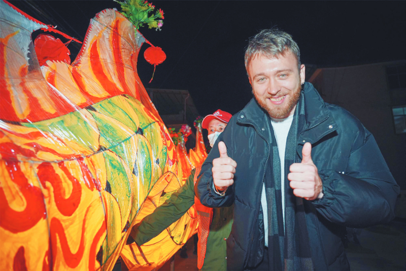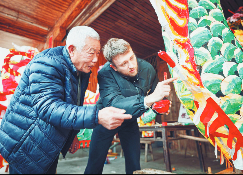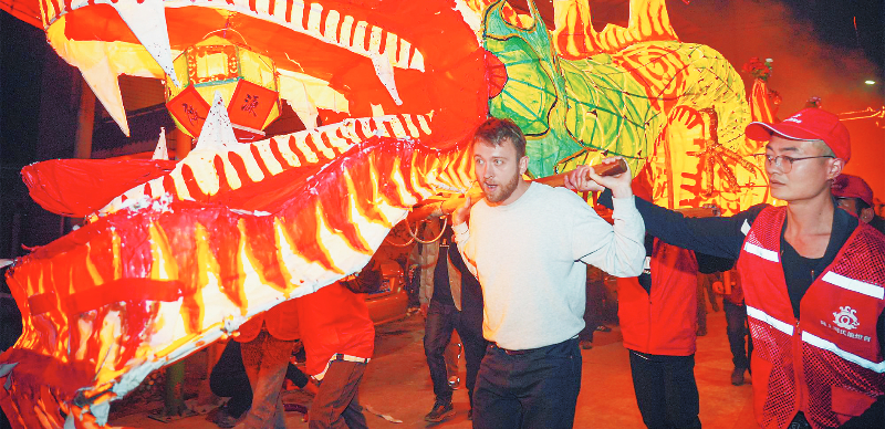 来自德国的留学生Arne Boettger在活动现场体验了大龙修补、抬龙,沉浸在小村庄一片欢乐的海洋之中。Arne Boettger表示,这是非常特别的一次经历,这是他第一次看到这么地道、有特色的民俗活动,当地老百姓非常热情,游龙活动非常精彩。