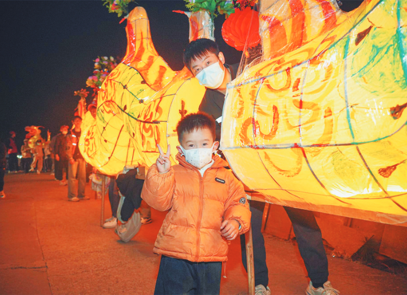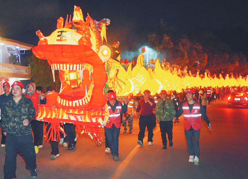 华灯初上,龙岗村街头巷尾张灯结彩,洋溢着喜庆的气氛。随着一声铿锵有力的锣鼓声,由42节花灯组成的长龙在村民们的共同努力下缓缓启动,蜿蜒穿行于村间巷陌,全长159.6米的长龙在夜色中显得格外壮观。