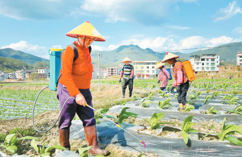 连日来,在永定区湖雷镇连片60多亩的烟草种植基地里,烟农们忙着为刚刚移栽的烟苗施肥,确保高产丰收。2025年,永定区计划收购烟叶13.3万担,种植面积4.75万亩。图为湖雷镇上北村烟农施肥现场。 通讯员 熊川 摄
