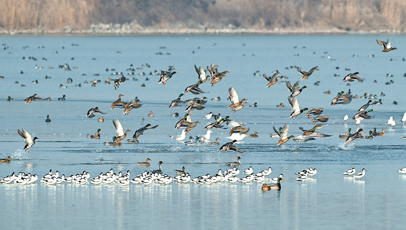 这是 2月 26日在天津七里海湿地自然保护区拍摄的候鸟。近期,随着气温回升,大批候鸟陆续飞抵天津七里海湿地自然保护区,为春日湿地带来勃勃生机。据介绍,今年天津七里海湿地自然保护区春季候鸟迁徙期将从2月中旬持续至4月,预计约有25万只候鸟过境。新华社记者 孙凡越 摄