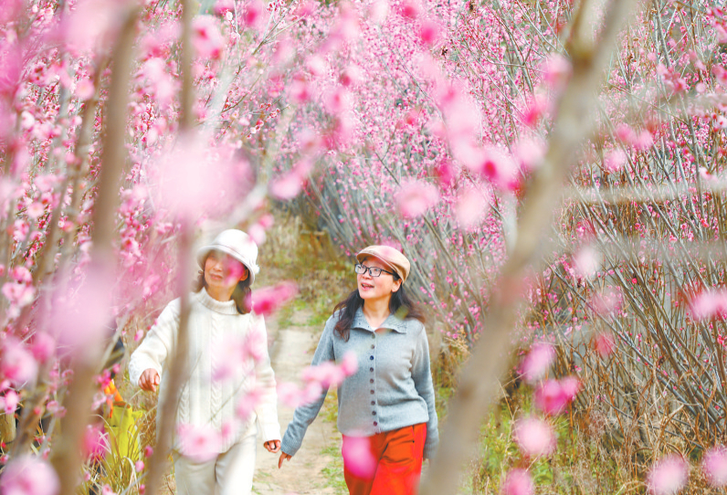 2月26日,人们在浙江省舟山市新城临长路附近赏梅花。早春时节,多地呈现生机勃勃的春日景象。 新华社发 张磊 摄