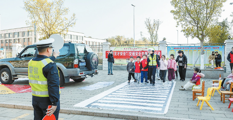 21日,在连城县莲峰镇栗园社区,县公安局交警大队为32名留守儿童开展了别开生面的“开学季”交通安全宣传活动。交警以“被看见才安全”为主题,向孩子们讲解了如何远离车辆盲区、如何安全过马路以及夜间出行应身穿颜色鲜亮的衣服等交通安全知识。图为民辅警引导儿童安全过马路。通讯员 张菡珏 吴如纯 摄