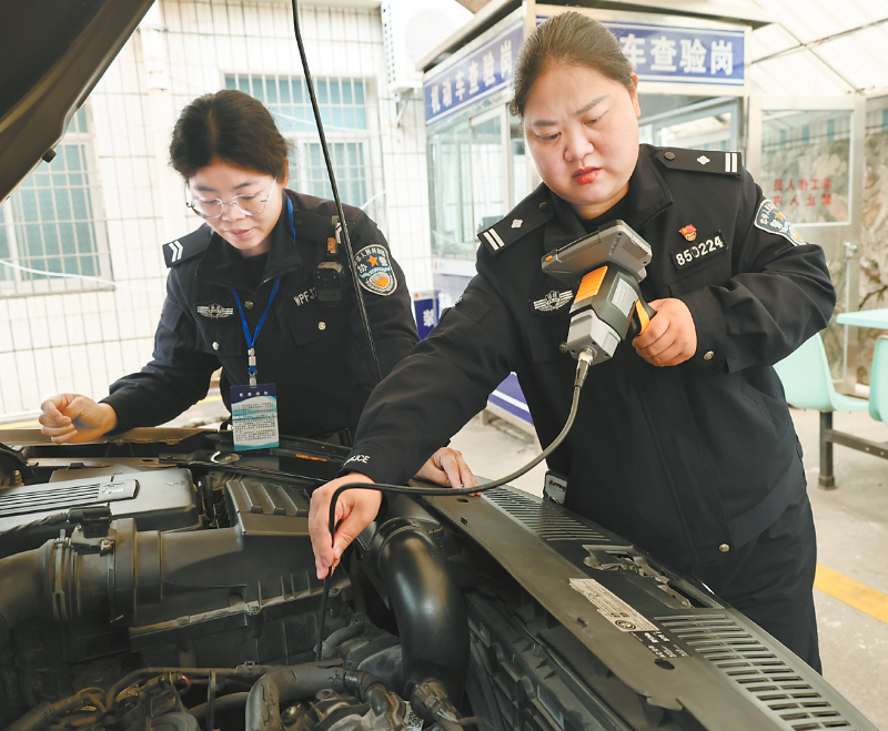 女民警辅警使用内窥镜严格验车。
