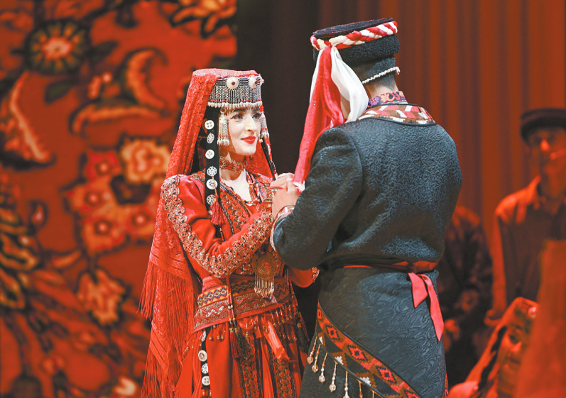 演员在新疆塔什库尔干塔吉克自治县葱岭演艺中心表演国家级非物质文化遗产——塔吉克族婚俗(3月22日摄)。新疆塔什库尔干塔吉克自治县(简称“塔县”)拥有多项国家级、自治区级非物质文化遗产。春分前后,塔县迎来赏春旅游旺季。当地以春日壮美生态景观为基础,整合传统文化、多元产业等文旅要素,打造多样文旅场景,丰富游客体验。新华社记者 胡虎虎 摄