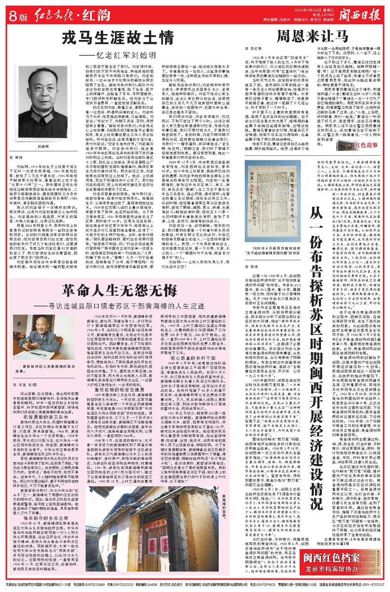 初次见到刘老,敬重之余,更感到刘老是一位慈祥、和蔼和深情的老人。刘老听力不太好,但思维还很敏捷,口齿清楚。刘老说:“年纪大了,双脚不灵活,否则,很想回家乡看看。”藏秘书告诉我们:刘老很关心上杭的事,《闽西日报》是他每天必看的报纸,有关上杭的事还要让工作人员念给他听。听刘老说话,还有很重的才溪口音,我对刘老说:“您老乡音未改呀。”刘老高兴地表示赞同。刘老告诉我们,他还是1932年中央红军在毛泽东的率领下攻打漳州时到过上杭城。当时刘老所在部队是红十二军,驻扎在上杭城关,其任务是阻止广东方面的国民党部队增援漳州,确保红军主力攻打漳州成功。那次战役之后,刘老就再也没有到过上杭城了。他说,上杭城很美,现在不知建设成什么样了。我们按刘老的提问,把上杭的城市建设及经济社会发展情况简要作了汇报。