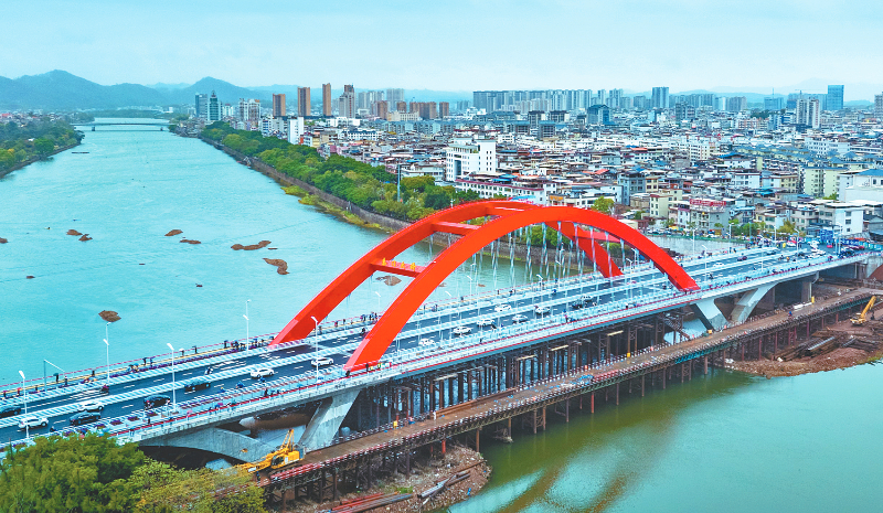 改建后的东门大桥全长约300米,梁段宽度达40米,设置为双向6车道。其独特的“中承式飞燕提篮拱桥”设计,形若提篮、势如弯月,将客家人“纳福聚祥”的美好愿景与现代桥梁美学完美融合,展现出别样的风采。