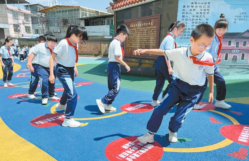 “孩子现在回家总讲红军故事,还把‘长征路线’画在本子上!这些课间活动让革命精神真正走进了他们心里。”站在龙岩学院附属小学的七彩校道上,六(1)班邱梓炆的妈妈孙小静指着地面上的“红军长征路线”标识感慨道。这所位于闽西革命老区的学校,从校门到操场的几百米路径上,精心布置了“闽西100个红色打卡点”图片展,江月苑的亭台地面上还原“红军长征路线”关键节点,让课间15分钟成为红色教育的鲜活载体。