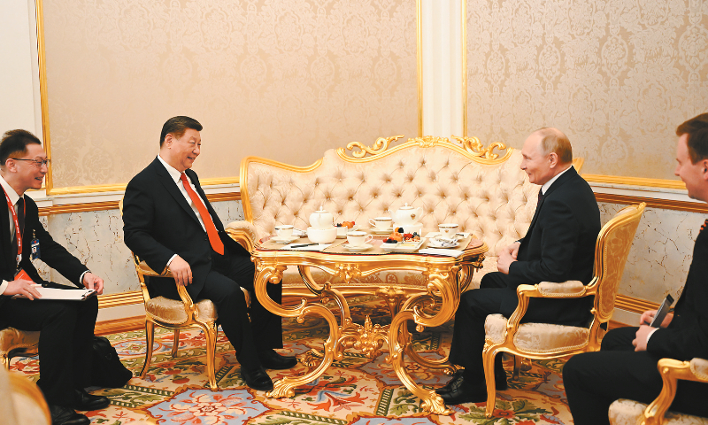 习近平指出,世界进入新的动荡变革期。只要中俄保持战略定力,坚持战略协作,就任何力量也阻挡不了两国实现各自发展振兴,阻挡不了中俄世代友好的民心所向,阻挡不了世界多极化和经济全球化的时代潮流。我愿同普京总统保持紧密联系,为中俄关系定向领航,为推动全球治理作出积极贡献。