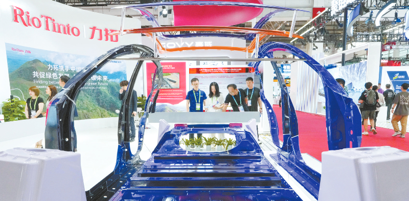 7月19日,在智能汽车链展区力拓公司展台,参观者在了解从铁、铝等原材料到新能源汽车白车身的全球新能源汽车产业链协同。在第三届链博会设置的智能汽车链展区,30余家中外企业和机构集中展示产业链上中下游的关键技术和产品,从核心原材料、关键元器件到三电系统、智能网联,再到纯电、混动等不同技术路线的智能汽车产业链,生动呈现产业协同创新发展的成果,让人充分感受到中国新能源汽车产业与世界“链接”,共进共赢。新华社记者 鞠焕宗 摄