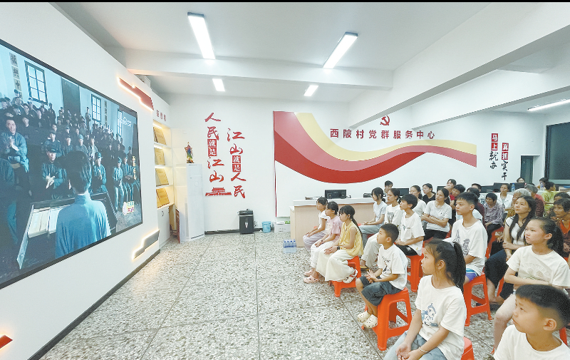 图为永定区高陂镇西陂村干群集体收看《浴血荣光》开播。