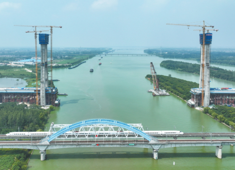 这是8月5日拍摄的沪渝蓉高铁跨京杭运河斜拉桥建设现场(无人机照片)。当日,由中国铁建大桥局承建的沪渝蓉高铁跨京杭运河斜拉桥主塔顺利封顶。该桥位于江苏扬州境内,是沪渝蓉高铁全线关键控制性工程,桥长564.3米,主跨300米。新华社记者 季春鹏 摄