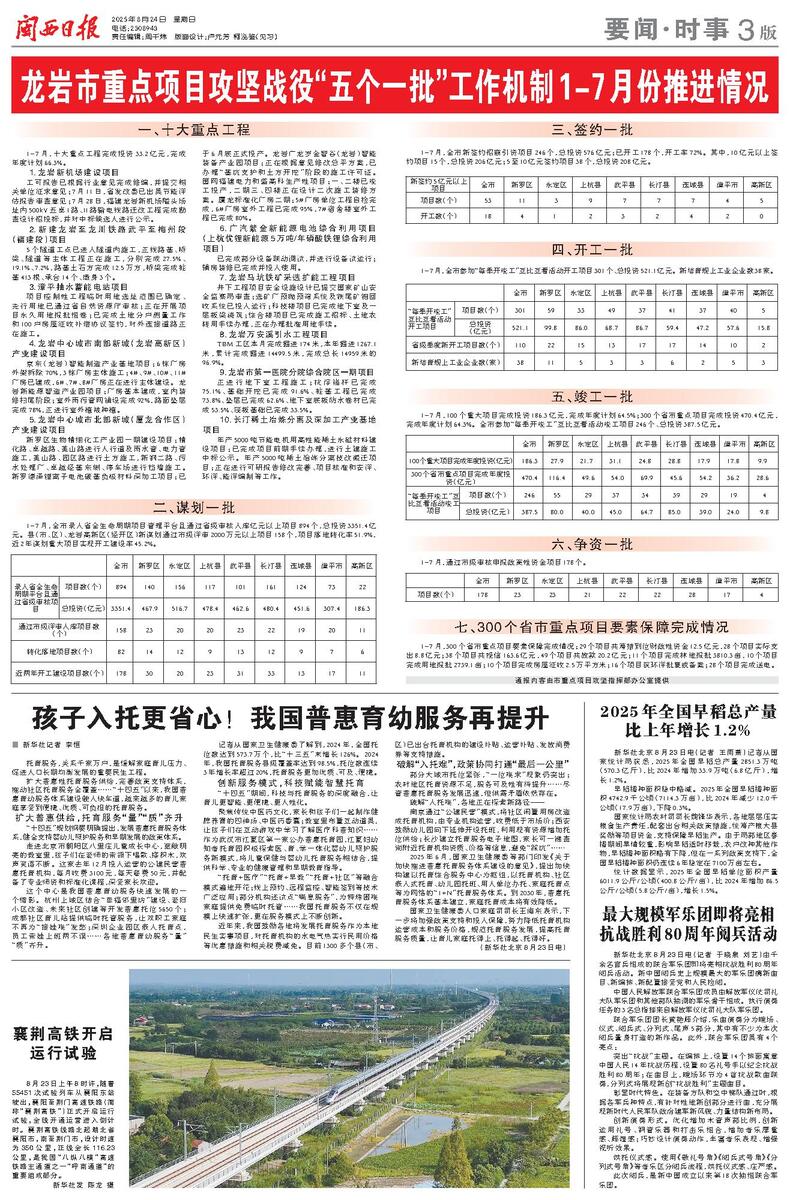 龙岩市重点项目攻坚战役“五个一批”工作机制1-7月份推进情况