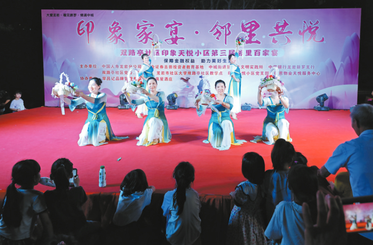 8月29日晚,新罗区中城街道双路亭社区印象天悦小区第三届邻里百家宴欢乐举办。小区居民带来菜肴,分坐40张圆桌,品尝美食,把盏举杯,同时欣赏了10多个自编自演的节目,共享和谐好时光。龙媒体记者 赖珊盛 通讯员 邱子祥 摄