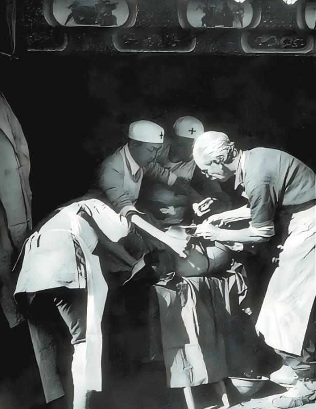 1939年10月27日,在河北省涞源县孙家庄村外小庙中,林金亮(左一)在协助白求恩为腹部受伤的伤员动手术。
