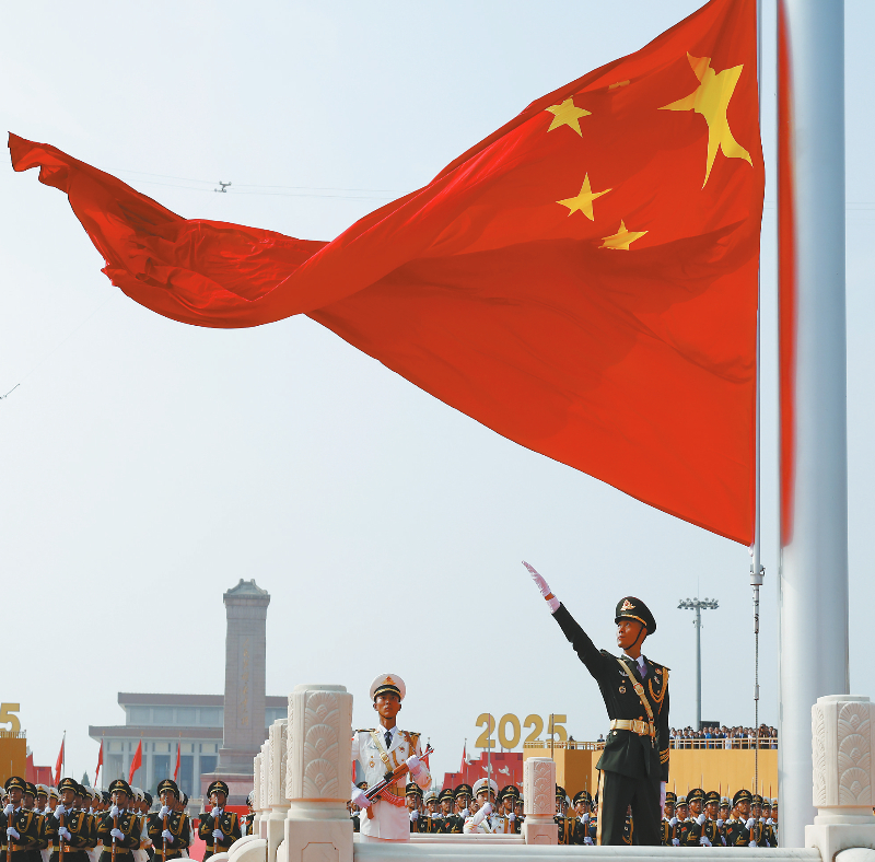 9月3日,纪念中国人民抗日战争暨世界反法西斯战争胜利80周年大会在北京隆重举行。这是天安门广场举行隆重的升国旗仪式。 新华社记者 费茂华 摄
