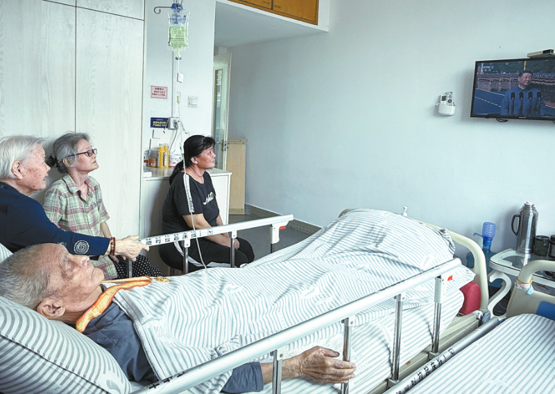 99岁高龄的抗战老兵李海宽在龙岩博爱医院观看阅兵式直播。 通讯员 范启椿 摄