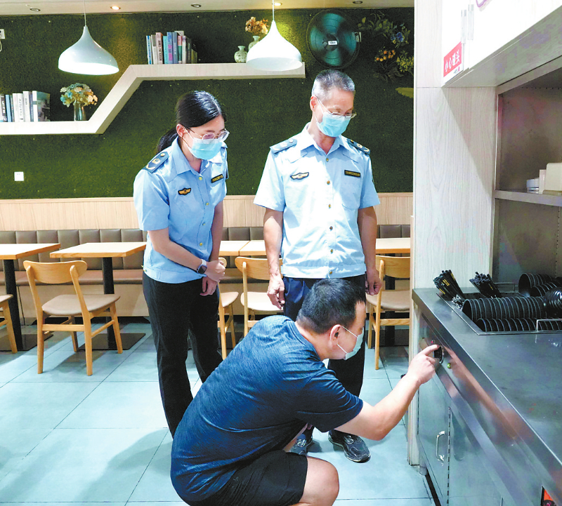 近日,永定区市场监管局执法人员在对学校周边沿街餐饮门店的餐具消毒设备进行检查。连日来,永定区市场监管局聚焦学校周边商超、便利店、餐饮店等重点经营场所,开展食品安全专项检查行动,为师生营造安全、放心的食品消费环境。截至目前,累计检查食品经营单位192家,发现并现场督促整改食品安全风险隐患38处。