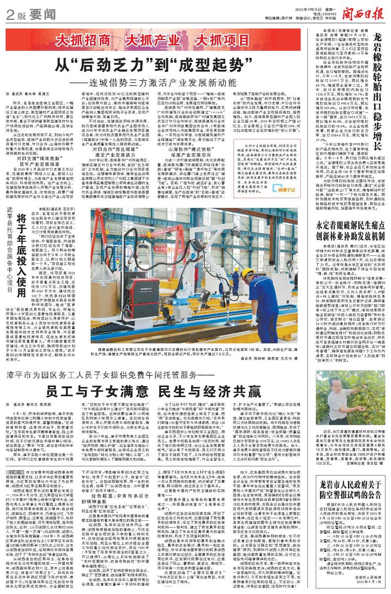 从“把脉输血”的外部帮扶,到“壮骨长肉”的内生发展,对口支援、对口合作与山海协作三股力量同向发力、汇聚成磅礴动能,推动连城产业实现提级换挡、提质增效。如今,连城县新型建材产业园入驻企业已超30家,2024年实现规上产值62亿元,占全县规上工业总产值的34%,成为拉动连城工业经济增长的“核心引擎”。