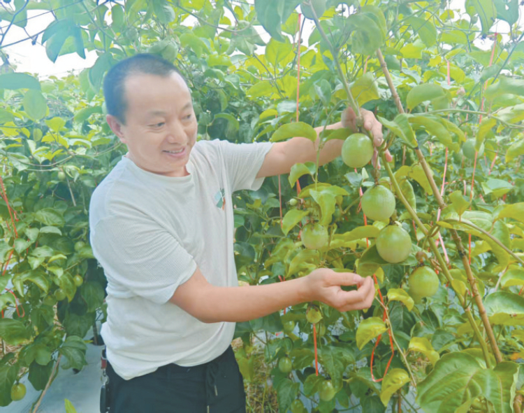 近日,长汀县童坊镇童坊村刘坑口种植大户童金长正在察看百香果长势。童金长是长汀县老军龙土地流转农民专业合作社理事长,今年合作社已采收百香果4期共12万多斤,销往福州、厦门、湖南等地。近年来,该合作社带动当地1300户农户种植姜黄、百香果、芙蓉李、药材等,助农增收152万元。 龙媒体记者 李文钲 摄