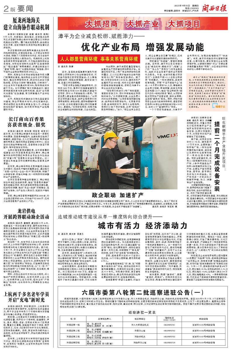 项目建设“加速跑”,营商环境是关键。近年来,漳平市以务实举措为企业“减负松绑、赋能添力”:组建“上门办”“马上办”“我来办”3支专业服务队,选派38名业务骨干提供全天候帮代办服务。对省、龙岩市级重点项目实行“1名县级干部+2-3名驻企特派员”专班模式,一线协调审批、政策申报等难题。开展“千名干部挂千企”活动,1-8月累计帮扶761人次,精准解决企业用工短缺、用地保障、政策兑现等各类难题122个;推出“驻企特派员+园区代办队+妈妈式服务”模式,从项目审批立项到生产经营运营,提供全周期、全流程“管家式”服务。同时,积极对接项目企业进行政策扶持申报,截至目前已指导358家企业申报政策补贴4.53亿元,完成13个“拿地即开工”项目。