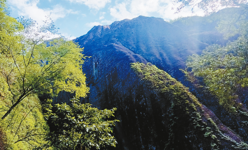 行至云窝附近,忽见前方嶙峋怪石间蹲踞着一尊栩栩如生的“石猴”。那巨石酷似猕猴,弓背蹲坐,昂首远望,宛如一位山林守望者,千百年来守护着这片秀美山川。绕过云窝东侧岩壁,眼前豁然开朗——一道状如巨象垂鼻的丹霞赤壁凌空而立。岩缝间几丛翠绿的芒萁迎风摇曳,宛如巨象饮水时溅起的水花。这鬼斧神工的天然雕塑,让人不禁屏息驻足。