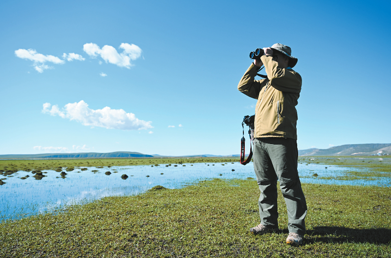 9月15日,宝金财在额尔古纳湿地自然保护区使用望远镜观测鸟类。 新华社记者 贝赫 摄