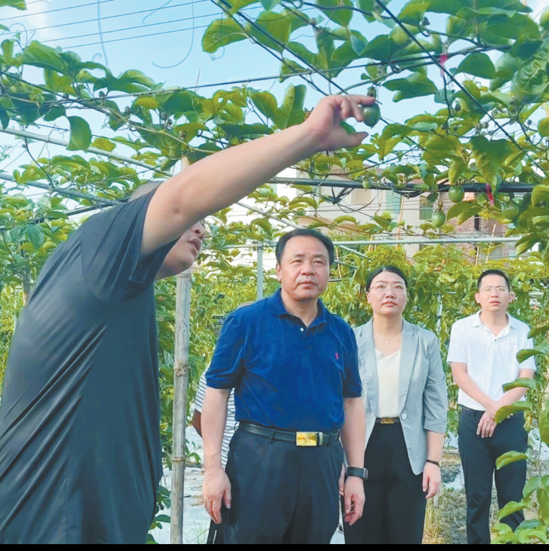 新罗区“晚霞增辉”乡村振兴志愿服务队成员余平溪在苏坂镇为农户讲解百香果种植技术。