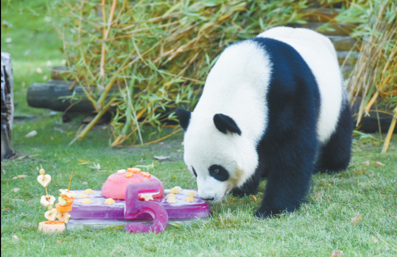 9月20日,在西班牙马德里动物园,大熊猫“金喜”享用生日“蛋糕”。该动物园为旅西大熊猫“金喜”和“茱萸”举办了隆重的生日会,数百名游客热情参加活动,祝这对大熊猫五岁生日快乐。 新华社发 古斯塔沃·巴连特 摄