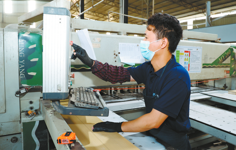 本报讯(龙媒体记者 谢泽铧 通讯员 段乐闻 文/图)近日,记者走进位于新罗区东城街道东宝工业集中区的龙岩市金开泰建材有限公司生产车间看到,机器轰鸣不绝,工人们穿梭在生产线之间,熟练地进行着门套开槽、面板切割、门套切割裁剪等工序。