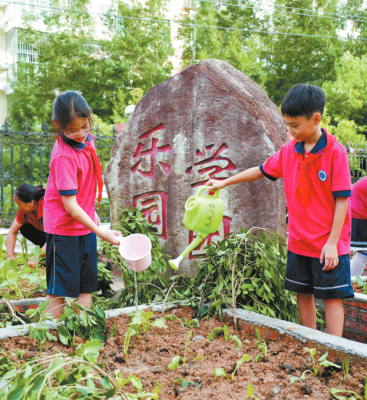 在基地另一侧,科学老师谌老师正蹲在地里,手把手教学生辨别杂草与菜苗。“劳动基地不仅是耕种的地方,更是‘活教材’。”谌老师介绍,学校将劳动教育与学科知识结合,比如在播种时讲解植物生长周期,在浇水时科普水资源保护,让学生在实践中掌握知识、提升能力。“之前有个学生特别内向,自从参与劳动后,不仅主动和同学交流种植技巧,还会分享自己的观察日记,整个人都变得开朗了。”