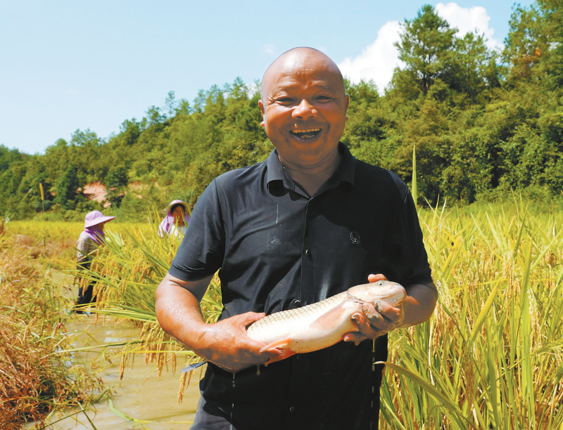 图为丘炳生捧着稻花鱼,脸上洋溢着丰收的喜悦。