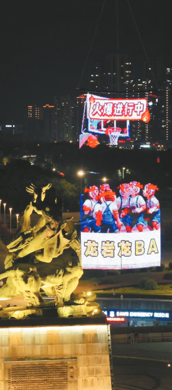 10月3日,在龙岩中心城区,“龙BA”赛场外的夜空,一架无人机不断投屏出“龙BA加油”等标语,为赛场上的球员们呐喊助威。通讯员 杨晶 摄