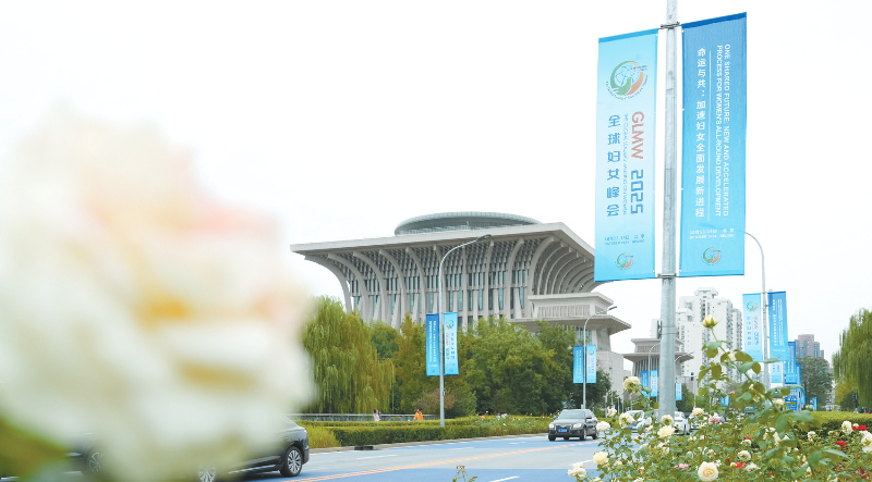 这是10月12日在北京街头拍摄的全球妇女峰会道旗。全球妇女峰会将于10月13日至14日在北京举行。新华社记者 薛宇舸 摄
