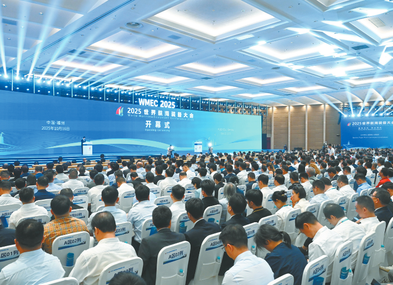 这是10月16日拍摄的2025世界航海装备大会开幕式现场。10月 16日,以“福海扬帆 绿动领航”为年度主题的2025世界航海装备大会在福建省福州市开幕。新华社记者 周义 摄