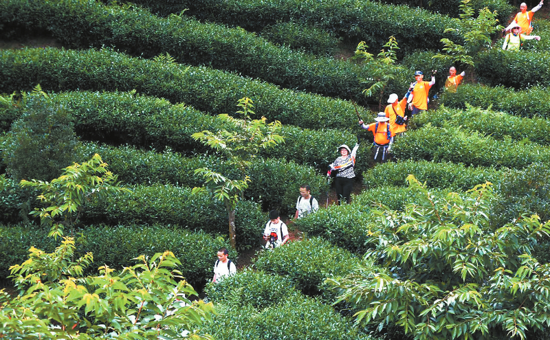 近日,连城县赖源乡黄宗村千米高山茶园迎来了来自江西瑞金的户外徒步爱好者。秋日里金风送爽,正是登山徒步的好时候,负氧离子充足的茶山成为许多喜欢户外徒步的游客的首选。“这里空气清新,是户外徒步游的好选择。连城的美食也是吸引我们的一大加分项。我们每年秋季都要来一次。”领队吴先生说。通讯员 邹善水 陈基鸿 陈慧敏 摄
