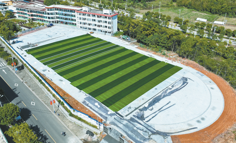 近日,在连城县林坊社会足球场建设项目现场,工人们正有条不紊地进行新草皮铺设、球场基础设施收尾等作业。该项目总投资265万元,主要新建一座4500平方米的11人制标准足球场、317米环形四跑道塑胶跑道及其附属设施,预计11月份交付使用。通讯员 江钰婷 林嘉伟 摄