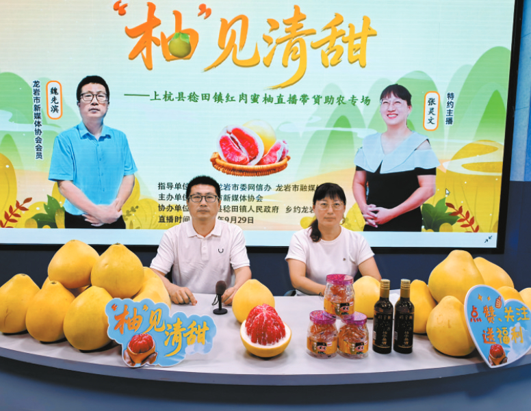 近日,龙岩市新媒体协会联合上杭县稔田镇举办“柚”见清甜——稔田“蓉湖”红肉蜜柚直播带货助农专场活动。此次活动带动稔田镇红肉蜜柚的销售,助力乡村振兴,村民共富。 通讯员 罗洪强 魏先滨 摄