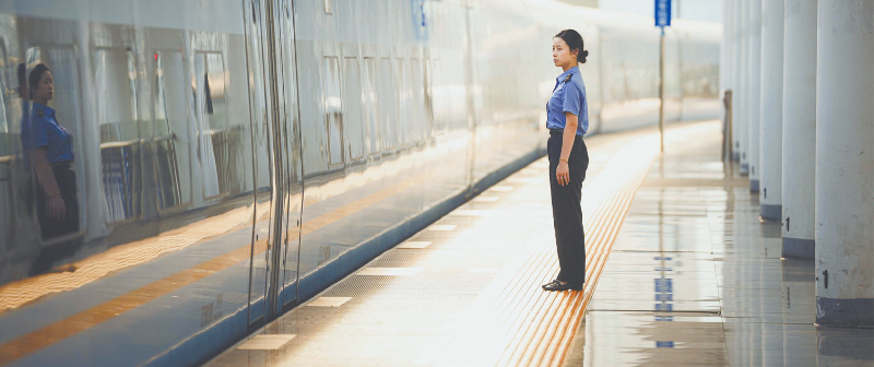 动车站台上,工作人员微笑着引导旅客,旅客们带着行李,期待着即将开始的旅程。此时,晨光熹微,金色的光线洒在站台上,为人们的身影镀上了一层金边,龙岩站当日始发的第一辆“复兴号”在晨光中缓缓驶出站台。