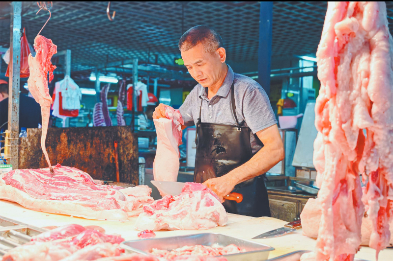 凌晨4点,东城农贸市场的摊贩正在切肉、备货。龙媒体记者 章宸睿 摄