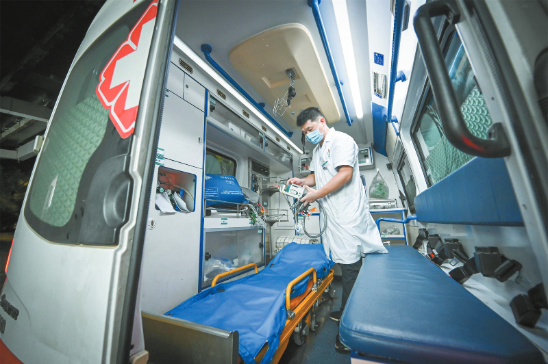 龙岩市第二医院急诊科医护人员完成院前急救任务后,在救护车内细致整理仪器。龙媒体记者 方晨颖 摄