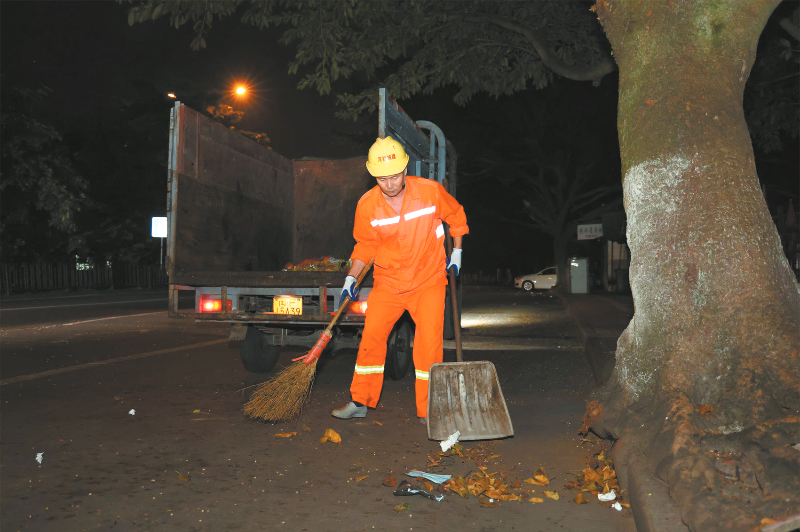 清晨的路灯下,环卫工人身着醒目的橘黄色工作服,在微凉的晨风中缓步前行。他们挥动着扫帚,有节奏地清扫着路面,昏黄的灯光映照着他们的脸庞,眼神专注而坚定,橘色的身影在街道上显得格外坚实,他们用勤劳的双手,为城市的整洁美丽默默奉献。