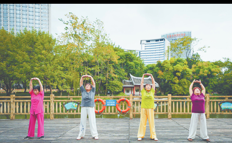 石锣鼓湿地公园内,市民正在晨练。龙媒体记者 章宸睿 摄