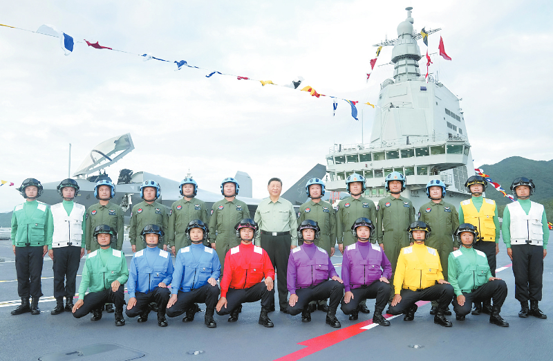 11月5日,我国第一艘电磁弹射型航空母舰福建舰入列授旗仪式在海南三亚某军港举行。中共中央总书记、国家主席、中央军委主席习近平出席入列授旗仪式并登舰视察。这是习近平同舰载机飞行员、航空保障人员合影留念。