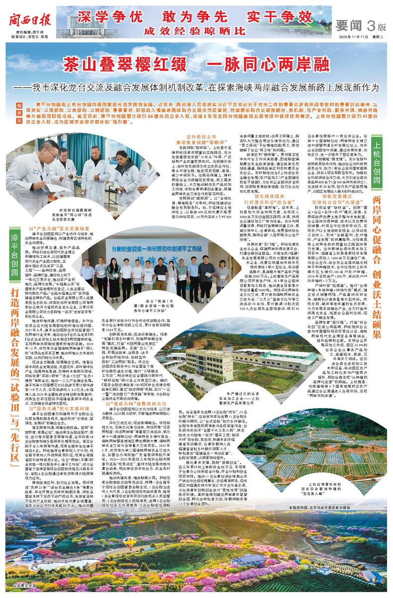 创新服务机制,促进深度融合。探索“党建引领乡村振兴,助推两岸融合发展”模式,打造“大陆阿里山党旗红”特色党建品牌。实施“五心”工程,开展送政策、送服务、送平台和助开拓市场、助转型升级的“三送两助”服务。成立台创园司法服务中心与全国首个维护台商权益合议庭,推行“三缘融合工作法”,相关做法在全国践行新时代“枫桥经验”研讨会上作典型交流。编印《服务台胞法律政策100问》《涉台法律法规政策汇编》,建立“政法保姆”机制,实行“一企一警”“流动窗口”“我来跑”等举措,为台胞台企提供全天候法治保障。
