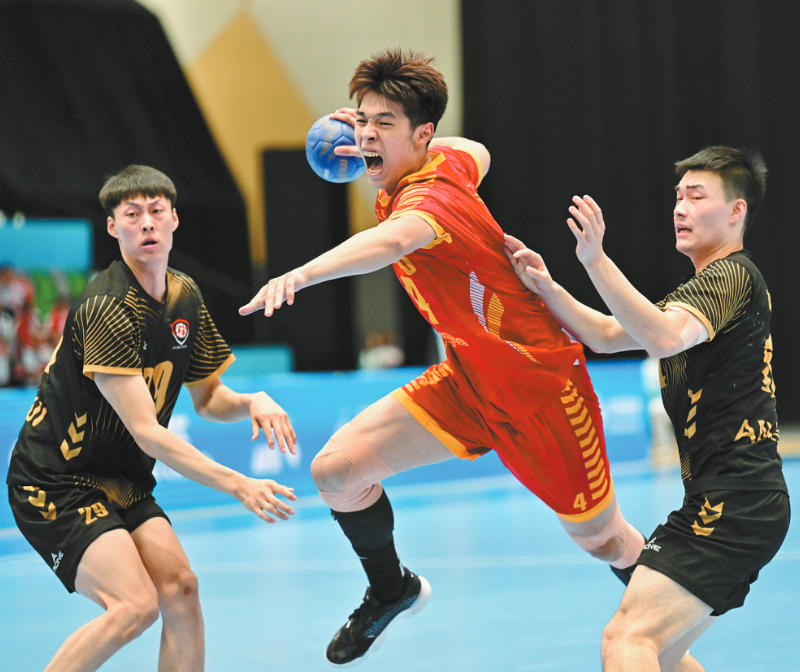 11月10日,江苏队球员季雨(中)在比赛中。11月10日,在香港举行的第十五届全国运动会男子手球金牌赛中,江苏队29比26战胜安徽队,夺得金牌。新华社记者 于洋 摄